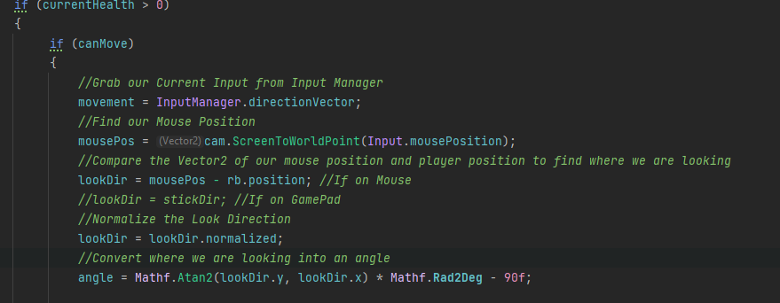 We first find the vector of our mouse position and our player position and subtract them to see which direction the player is looking. We then normalize it and eventually convert it into an angle to be used later.