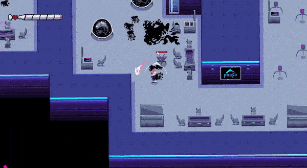 Pacific Takedown is a top-down pixel art action game set in a cyberpunk future. Pacific has been slowly destroying her cozy seaside town, polluting the waters and taking all the people away from their brutal work schedules. Mizuki has seen enough! Armed with her metal baseball bat, she busts her way into the Pacific headquarters and decides to take matters into her own hands, smashing robots and discovering more about the nature of the company.
